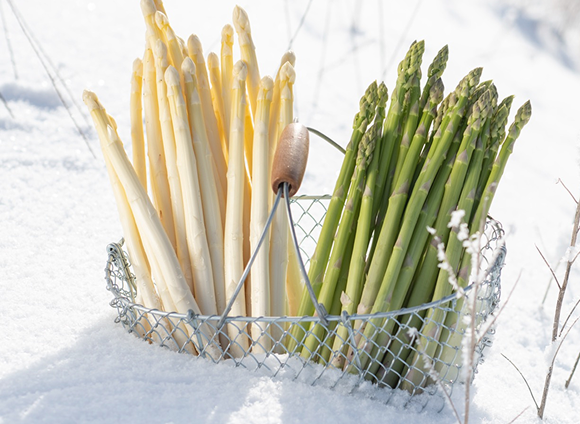 冬に旬を迎える当農場の雪アスパラ®は、12月~2月限定で収穫される特別なアスパラです。グリーンとホワイトの2種類があり、夏のものとは異なる、これまでにない究極のおいしさを追い求めています。 グリーン・アスパラは、アスパラらしい風味を残しつつ、驚くほど柔らかい食感とみずみずしさが特徴です。ホワイト・アスパラは、根元ほどきわだって強い甘みを感じられる、まったく新しい味わいをもつ逸品です。 冬のメイン食材となる地域特産の野菜を作り、届けたいという想いから生まれた雪アスパラ®。これまで多くのお客様に喜んでいただいています。